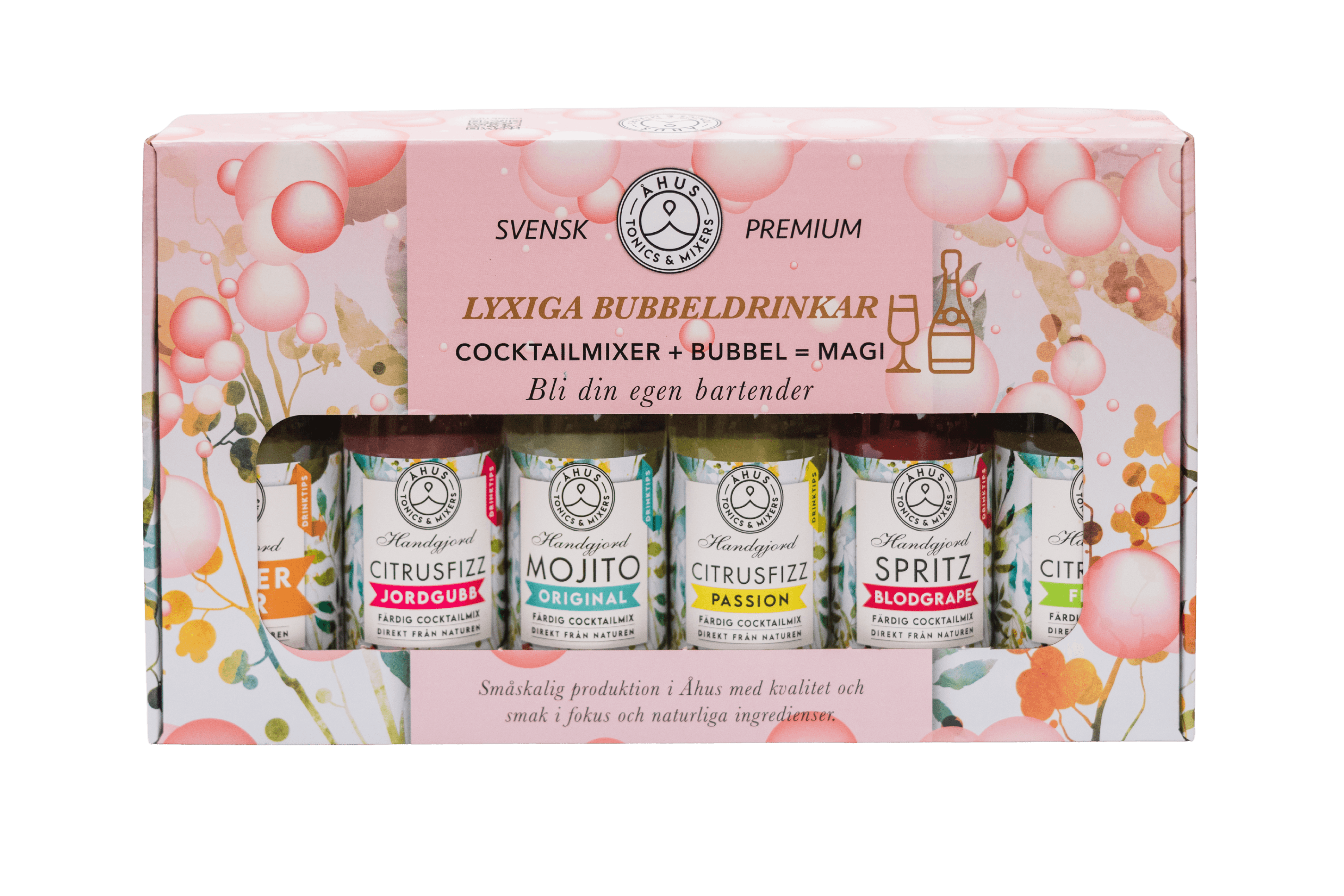 Cocktailmixers, färdiga att dricka, kan blandas med alkohol, men perfekta mocktails, 6 olika smaker – Jordgubb Citrusfizz, Fläder Citrusfizz, Passion Citrusfizz, Mojito, Blodgrape Spritz och Ginger Beer